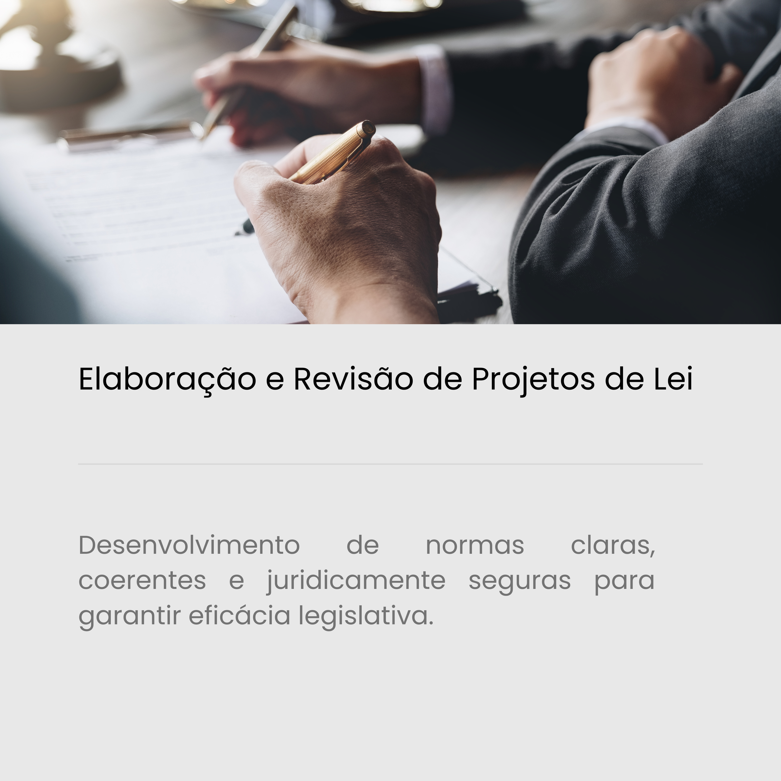 Sim. Auxiliamos na elaboração, análise e revisão de projetos de lei, garantindo clareza técnica, constitucionalidade e segurança jurídica, bem como o cumprimento do devido processo legislativo.